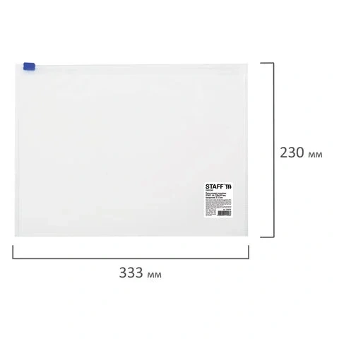 Изготовлена из прочного прозрачного пластика толщиной 0,12 мм с гладкой фактурой. Формат А4 (333х230 мм). Герметичная застежка-зиплок защищает документы от механических повреждений, а также пыли и влаги. Цвет молнии - ассорти (поставляется без возможности выбора).