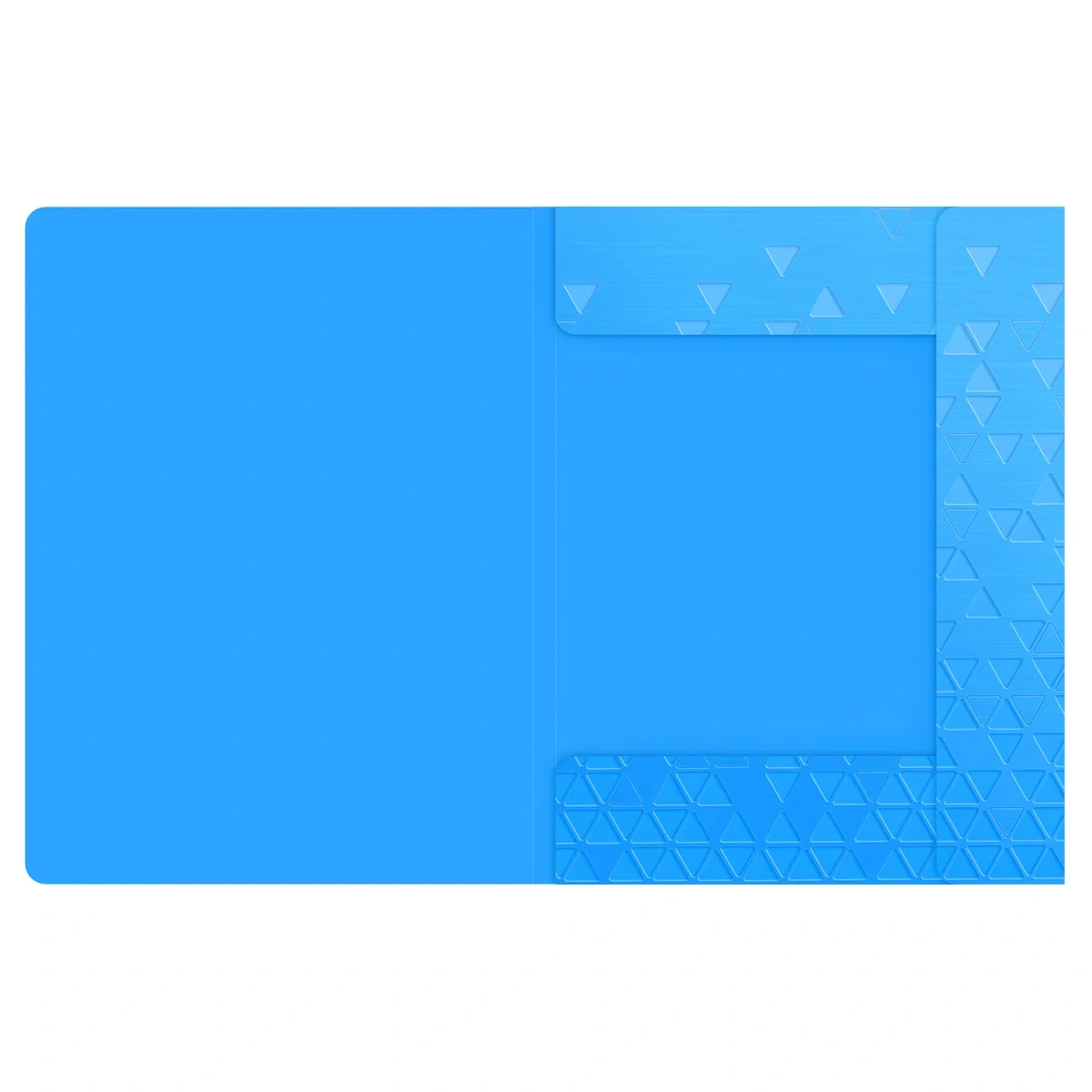 Папка изготовлена из высококачественного полипропилена с матовой текстурой поверхности «рельефные треугольники», на которой не видно отпечатков пальцев и мелких царапин. Толщина обложки 600 мкм. Надёжные застёжки-резинки помогают избежать повреждения документов и легко открываются. Яркий голубой неоновый цвет поможет поднять настроение в серые рабочие будни. Упакована в индивидуальный прозрачный пакет по форме.
