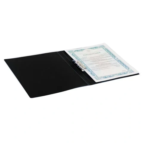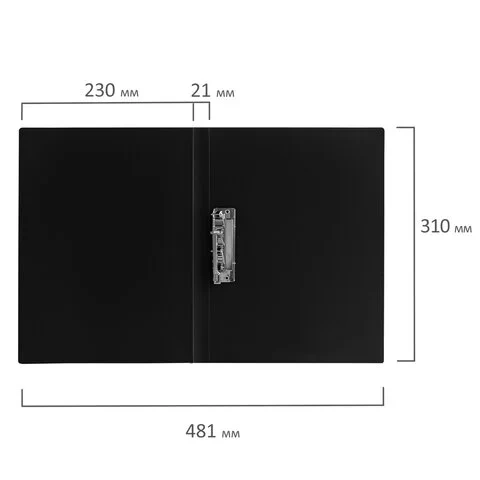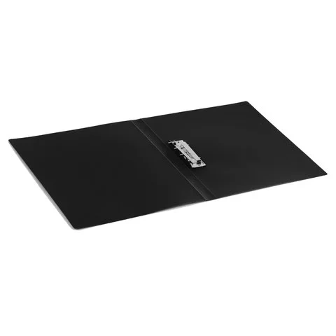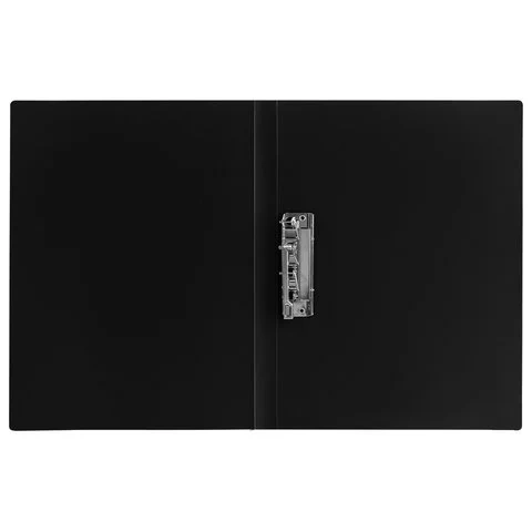 Изготовлена из высококачественного пластика толщиной 0,6 мм с фактурой 'песок'. Обеспечивает хранение до 100 листов формата А4. Снабжена боковым прижимом. Для идентификации имеется бумажный корешок. Представлена в классическом черном цвете. Поставляется в индивидуальной упаковке.