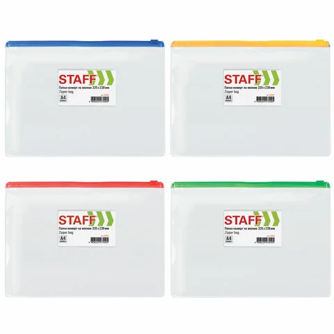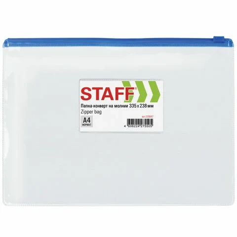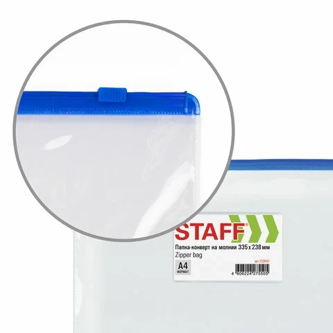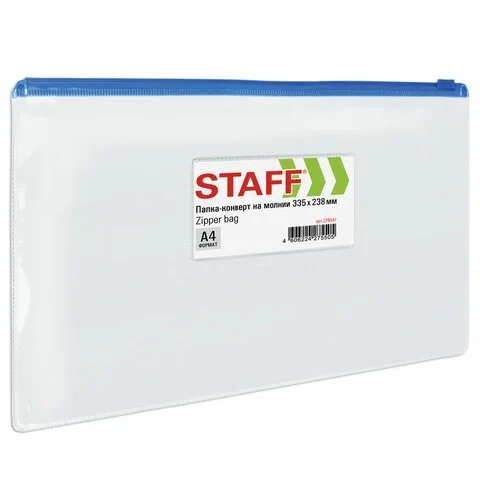Папка-конверт на молнии А4 (335х238 мм), карман для визиток, прозрачная, 0,12 мм, STAFF, 229547