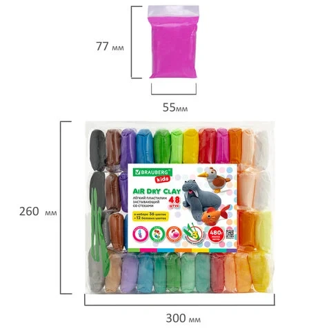 Пластилин супер лёгкий воздушный застывающий 48 шт. (36 цветов + 12 базовых), 480 г, 3 стека, BRAUBE