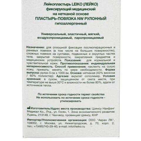 Пластырь-повязка рулонная LEIKO 5х1000 см, на нетканой основе 'Липкий бинт', 132824