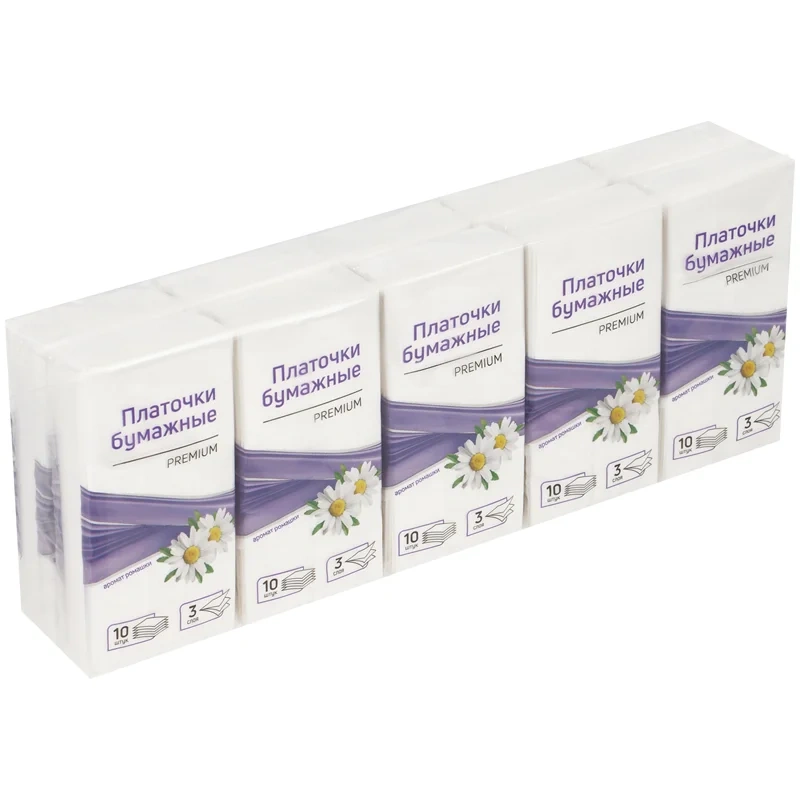 Платки бумажные носовые OfficeClean, 3-слойные, 19*20см, белые, 10 пачек по 10шт., ромашка