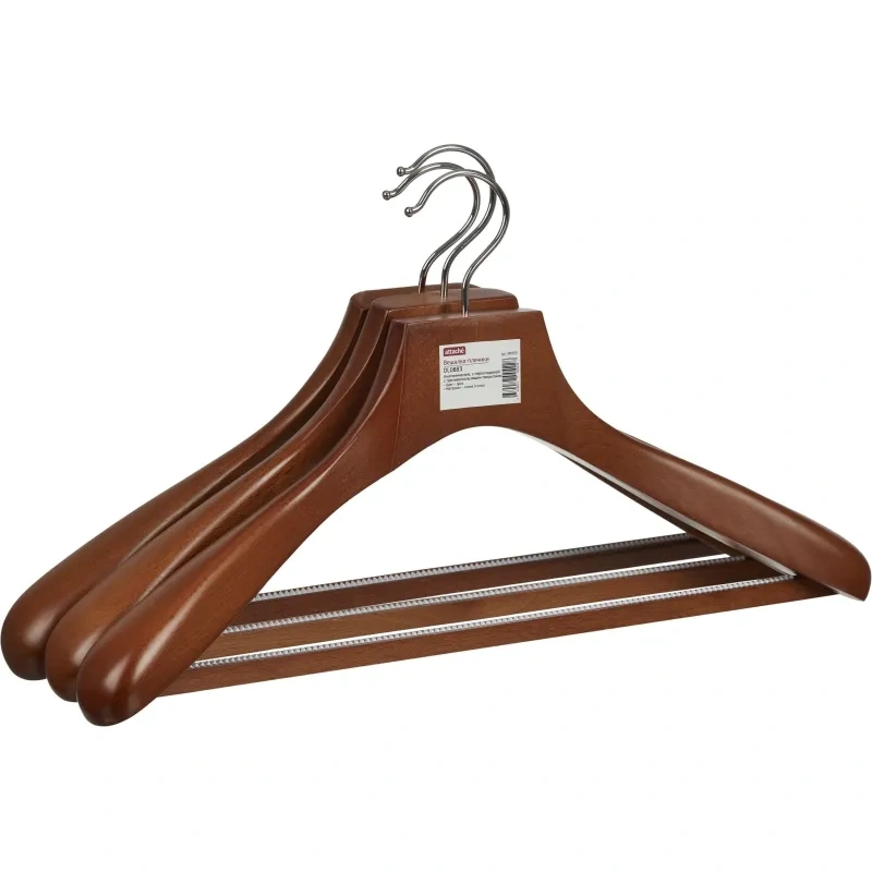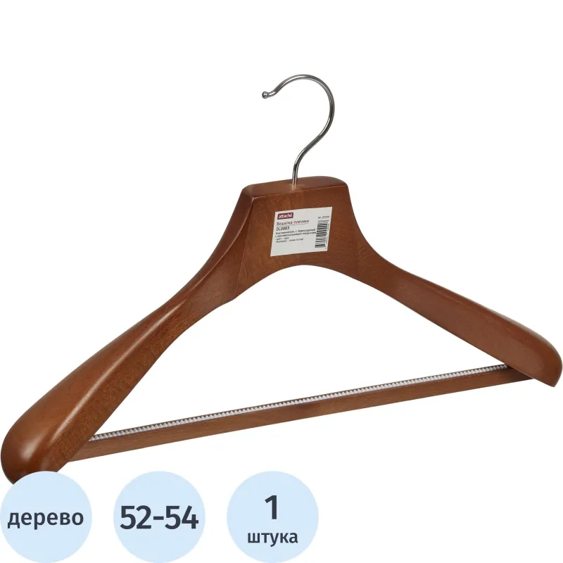 Анатомическая вешалка-плечики размера 52-54 — Jas Attache изготовлена из натуральной древесины поверхность изделия покрыта лаком. Вешалка оснащена перекладиной для юбок и брюк. Ширина плечиков 48 см. Схема вложения — 20 штук в упаковке. Поставляется поштучно.