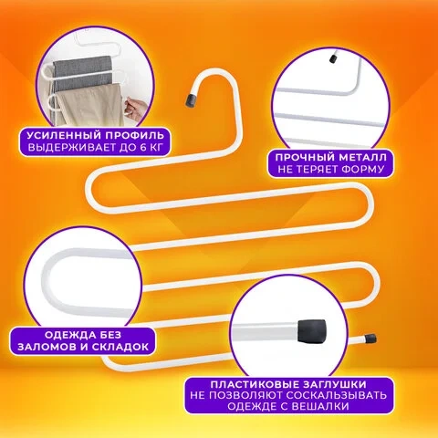 Предлагаем универсальную металлическую вешалку, которая поможет организовать пространство и создаст уют в доме. Вешалки для одежды изготовлены из прочного металла. Многоуровневая вешалка для брюк эстетичной изогнутой формы выдерживает до 6 кг благодаря усиленному металлическому профилю. Она не погнется даже под тяжестью зимних штанов или мокрых полотенец. Пластиковые заглушки на концах не позволят соскальзывать одежде с вешалки, а самому аксессуару с перекладины шкафа. Вешалка компактная и не занимает много места - ее размер 34 на 36 см, При этом на одной такой вешалке можно разместить до 5 предметов одежды. Подойдет для брюк, женских и мужских шарфов, широких декоративных шейных платков, галстуков и других аксессуаров гардероба. Вешалку 'Змейка' можно использовать как для взрослой, так и для детской одежды.