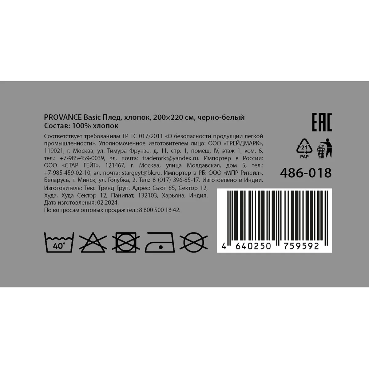 Плед Provance Basic черно-белый хлопковый, 200 x 220см