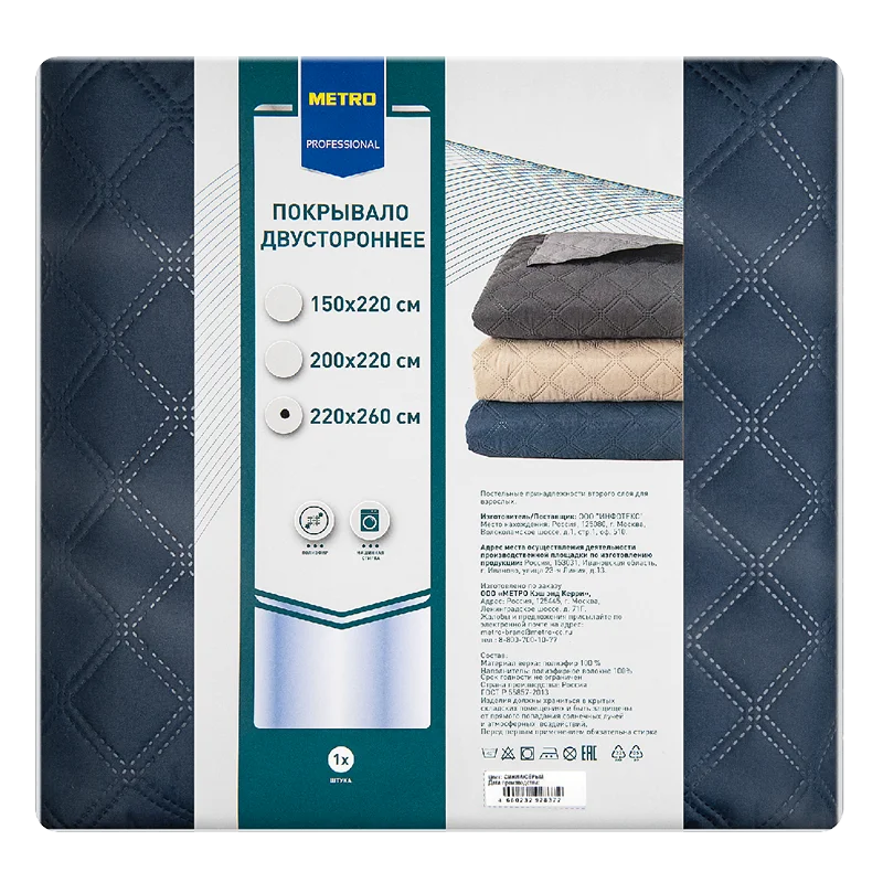 METRO PROFESSIONAL Покрывало двустороннее синее-светло-серое полиэстер-синтепон, 220 x 260см