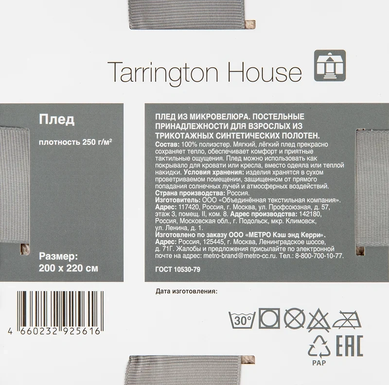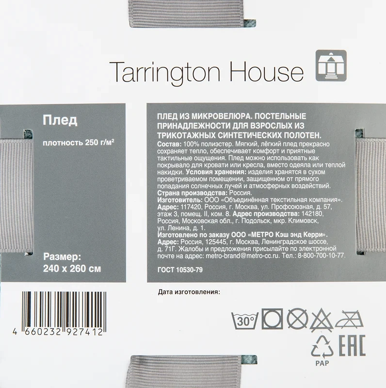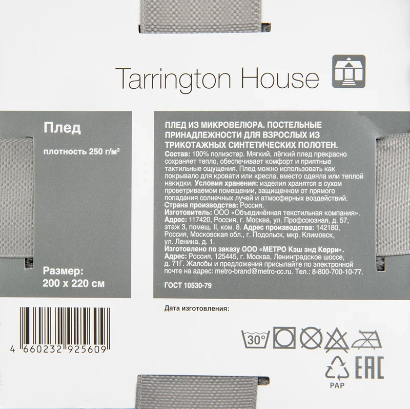 Tarrington House Плед графитный микрофибра велюровый 280г, 150 x 200см