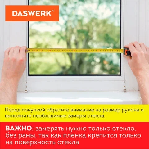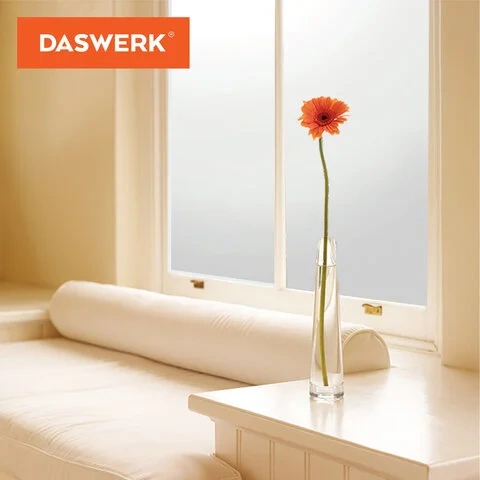 Плёнка на окно DASWERK поставляется в рулоне шириной 67,5 см и длиной 1,5 м. Плёнка подходит для установки на комнатные и балконные окна, стеклянные двери и перегородки, дверцы шкафов и полок, а также дверцы и перегородки душевых кабин. Оконная пленка не затемняет помещение, пропуская 75% солнечного света и тепла, в то же время, отражая 75% ультрафиолетового излучения, плёнка защищает предметы мебели и интерьера от выгорания и потери внешнего вида. Лицевая поверхность имитирует матовое стекло, украшая и подчёркивая интерьер, а также защищая от любопытных взглядов.