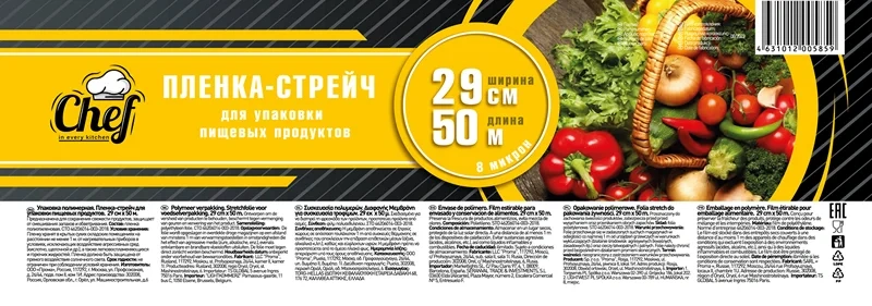 Пленка-стрейч Chef для упаковки пищевых продуктов, 29 см x 50 м предназначена для сохранения свежести продуктов. Она защищает от их смешивания запахов и обветривания. Пленка произведена из плотного высококачественного материала. Предназначена для упаковки и хранения сыров, колбас, полуфабрикатов, выпечки, фруктов, овощей, рыбы и мяса. Пленкой удобно накрывать разрезанные на части арбузы, дыни, цитрусовые, открытые тарелки с салатами и закусками. Сохраняет свежесть еды и ее полезные свойства, защищает пищу от заветривания и посторонних запахов. Аксессуар абсолютно безопасен для использования с пищевыми продуктами, так как не содержит вредных веществ и не взаимодействует с пищей.