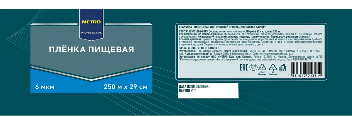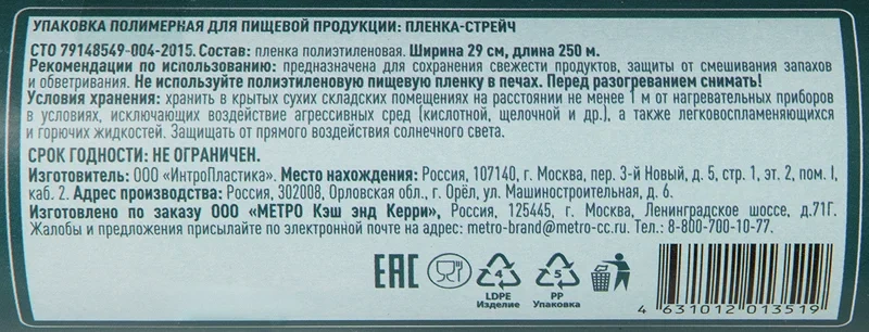 Пищевая пленка производится из экологически безопасного полиэтилена, имеет толщину 7,5 мкм. Стрейч-п...
