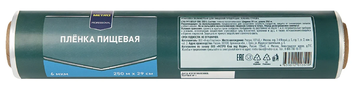 METRO PROFESSIONAL Пленка пищевая 29 см 6 мкм, 250 м - универсальная пленка для ежедневного использо...