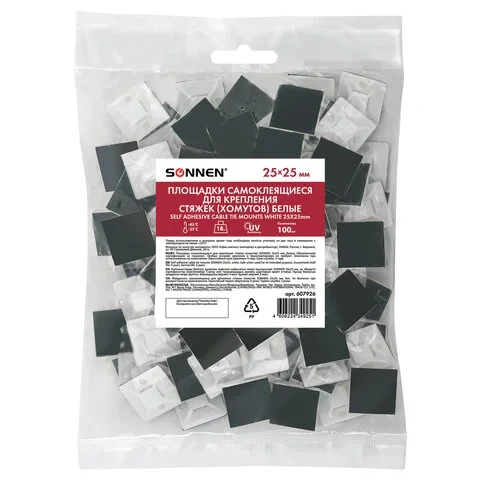 Площадка самоклеящаяся для крепления стяжки (хомута) 25х25 мм, КОМПЛЕКТ 100 штук, белая, SONNEN, 607