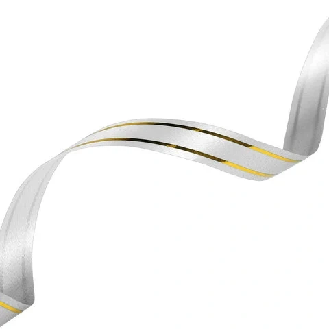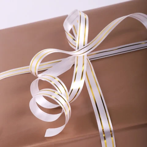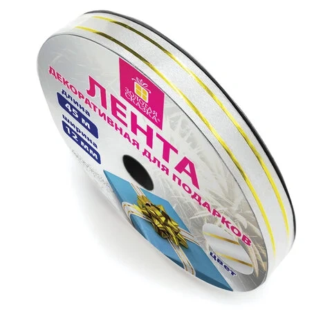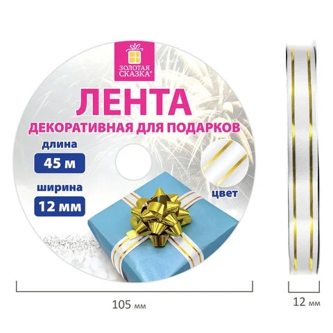 Лента упаковочная декоративная для подарков, золотые полосы, 12 мм х 45 м, белая, ЗОЛОТАЯ СКАЗКА, 59
