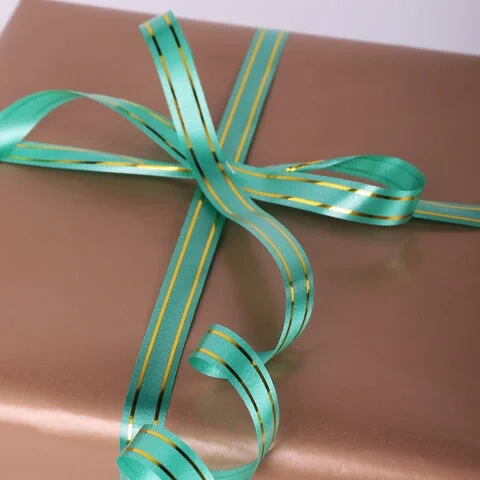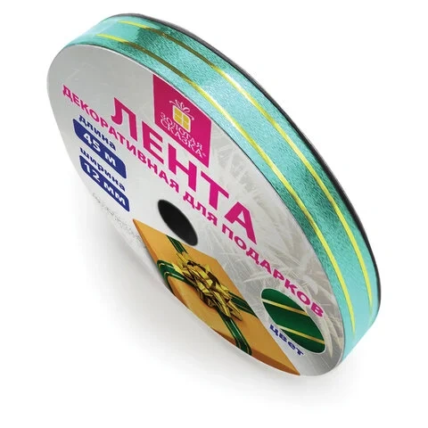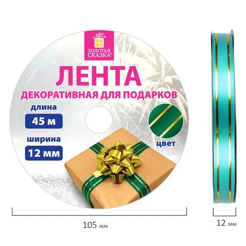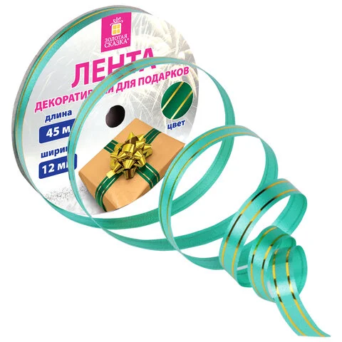 Лента упаковочная декоративная для подарков, золотые полосы, 12 мм х 45 м, зеленая, ЗОЛОТАЯ СКАЗКА,
