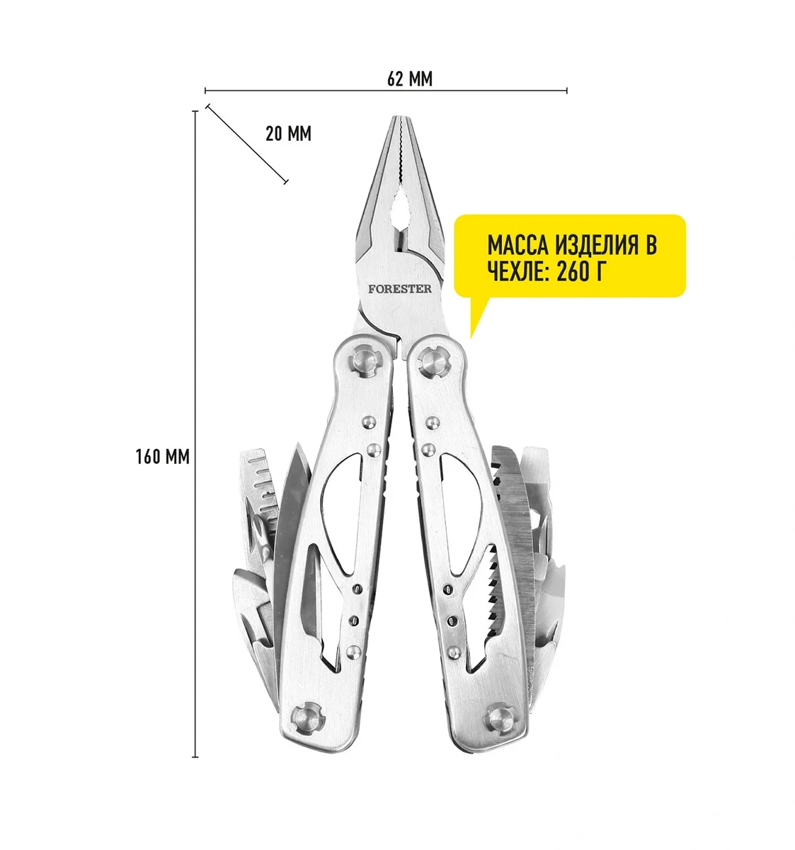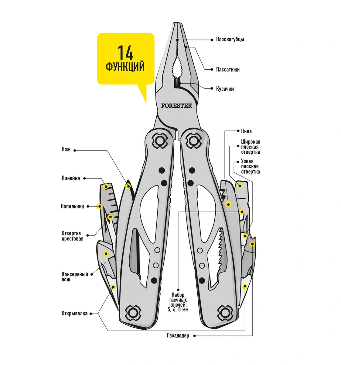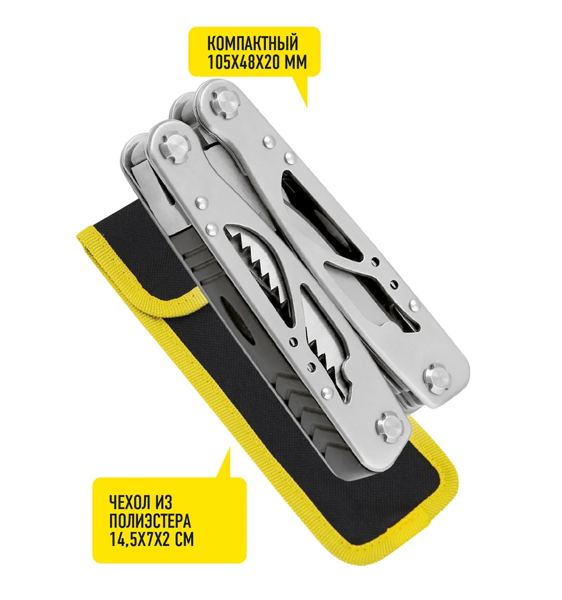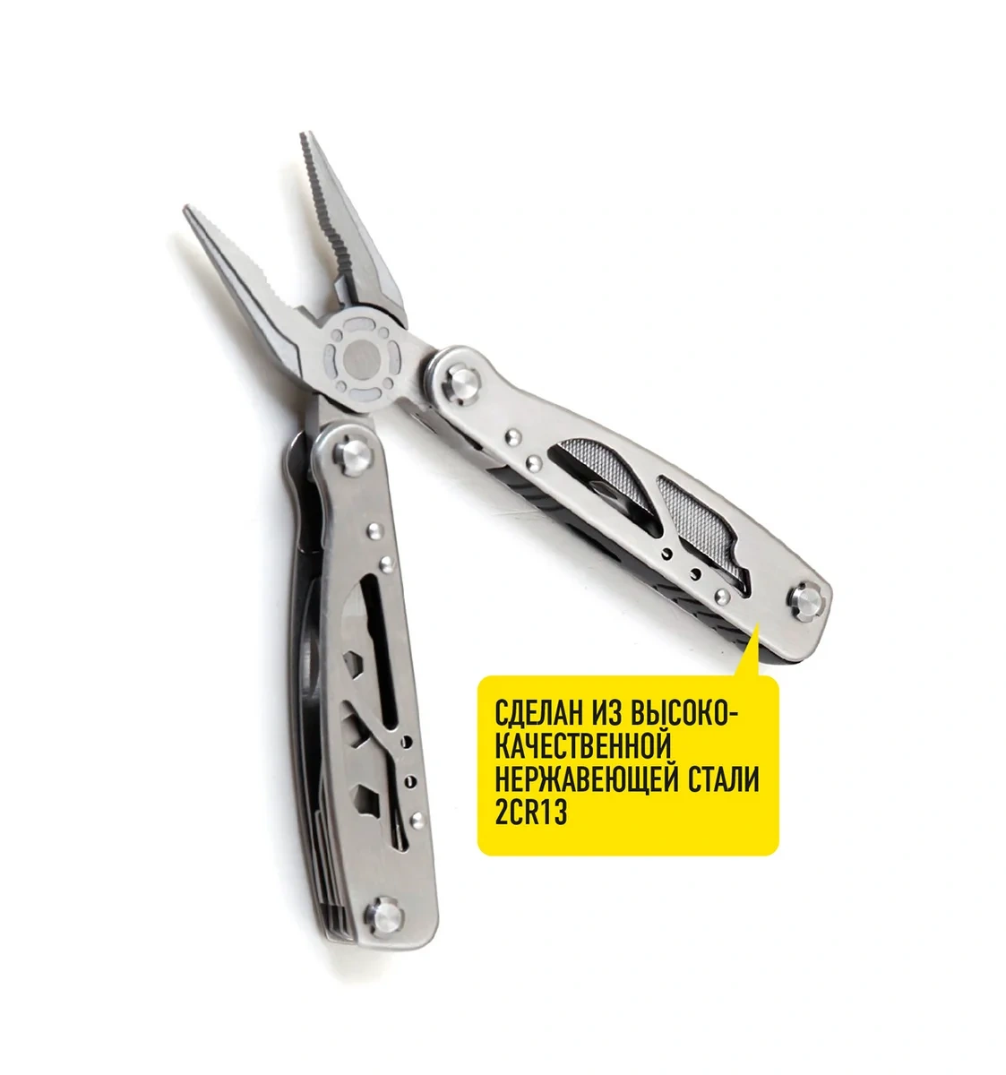 Многофункциональный инструмент, который включает 14 функций: плоскогубцы; пассатижи; кусачки для про...