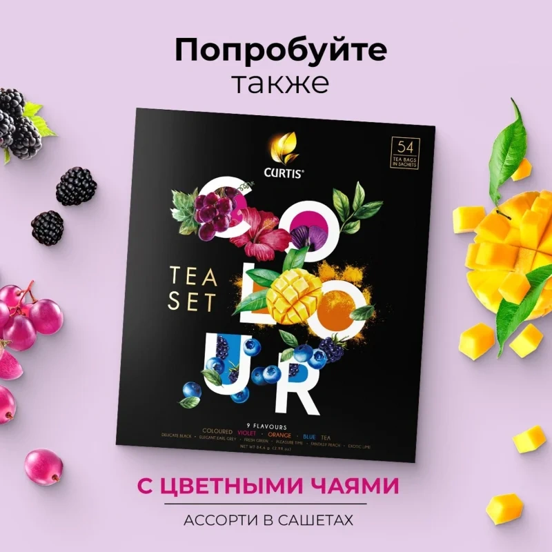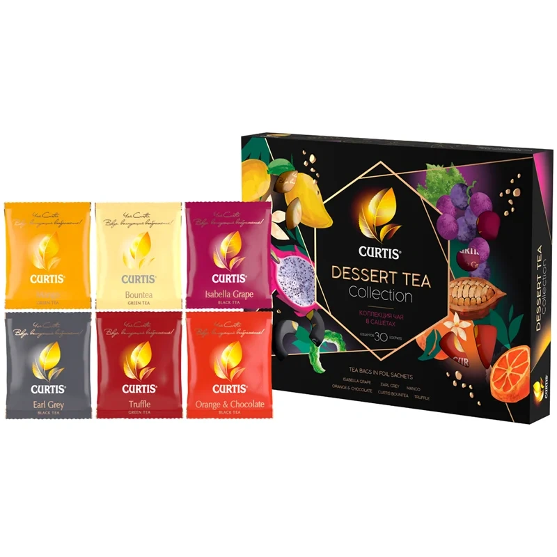 Чай ассорти Curtis Dessert Tea Collection 30 сашет. Подари набор изысканных вкусов чая, которые вдохновят на новые мечты. Выбирай многогранные вкусы из коллекции Curtis Dessert Tea Collection и наслаждайся яркими фруктово-ягодными и десертными ароматами. Удивительные сорта чая в купажах Curtis, неожиданные сочетания крупных кусочков ягод и фруктов дарят разнообразие изысканных, ярких вкусов и ароматов. Выпить чашку чая Сurtis — это удовольствие от момента побыть с собой и помечтать. Сurtis мотивирует людей мечтать и осуществлять мечты, рожденные за чашкой чая.