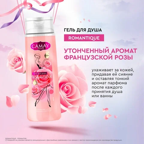 CAMAY Romantique создан для очищения вашей кожи и минут наслаждения. Аромат парфюмированного геля для душа раскрывается свежестью и прохладой зеленого яблока, которую поддерживают аккорды роскошного вихря красных роз. Основа аромата – нотки кедра, придающие этому аромату особую романтичность. Можно использовать как гель для душа и как пену для ванны. Аромат розы имеет успокаивающие свойства, способствующие расслаблению и отдыху после долгого дня. Воздушная пена геля бережно очищает кожу, оставляя ее увлажненной, мягкой и гладкой. Формула геля для душа также позволяет сохранить ухоженность кожи даже после принятия душа.