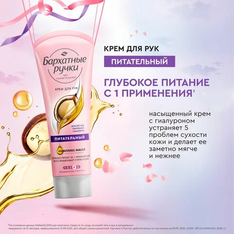 Для ухода за кожей рук воспользуйтесь питательным кремом от бренда БАРХАТНЫЕ РУЧКИ. Его формула с маслом ши и гиалуроном активно питает кожу рук, устраняя частые признаки сухости: стянутость, шелушение, чрезмерную потерю влаги, снижение упругости. Пантенол в составе крема успокаивает и смягчает, а масло ши увлажняет и предотвращает преждевременное старение кожи. Нежный аромат крема с древесными нотками подарит вам особое удовольствие и расслабление во время его использования. Насыщенная текстура крема легко впитывается, не оставляя липкости или жирной пленки на коже. Наносите крем перед выходом на улицу для защиты от обветривания, в течение дня по мере необходимости, после каждого мытья рук и на ночь для восстановления.