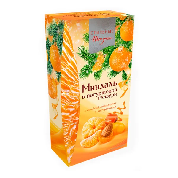 Цельный миндаль, в тонком слое хрустящей соленой карамели, заключенный в йогуртовую глазурь с добавлением мандарина.