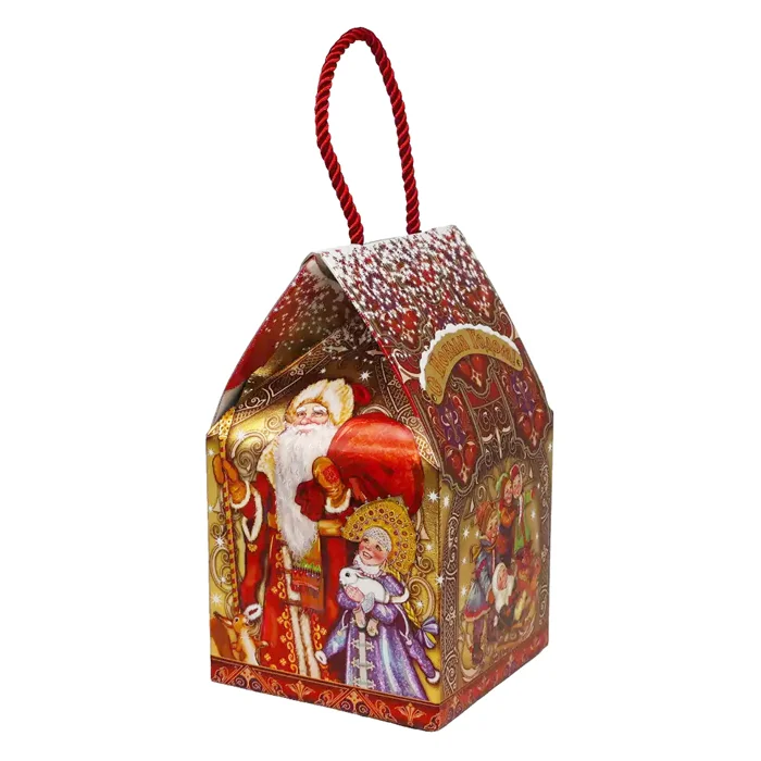Роскошный Новогодний сладкий подарок для детей и взрослых! Люкс упаковка в виде сказочного домика с эффектом многоцветного тиснения, с большим количеством золота в дизайне! Дед Мороз и Снегурочка - главные персонажи новогодних праздников! Символ Нового года, и конечно символ 2026 года! Великолепный орнамент, интересная конструкция в виде домика, красная плетеная ручка придают изысканность подарку. Эффект многоцветного тиснения - непременно оценят дети и взрослые. Упаковка металлизированная, вся переливается и создает то самое Новогоднее настроение! Наши подарки укомплектованы самыми вкусными конфетами и сладостями от лучших кондитерских производителей России: фабрики имени Крупской, Славянка, Акконд, КДВ, Вольский кондитер, Азовская, Сладуница, Нева, Дымка, Невский кондитер, Лотте, MARS и др.