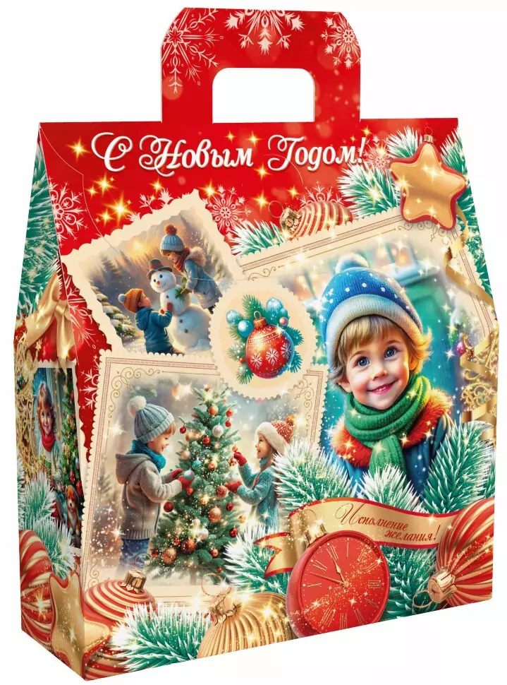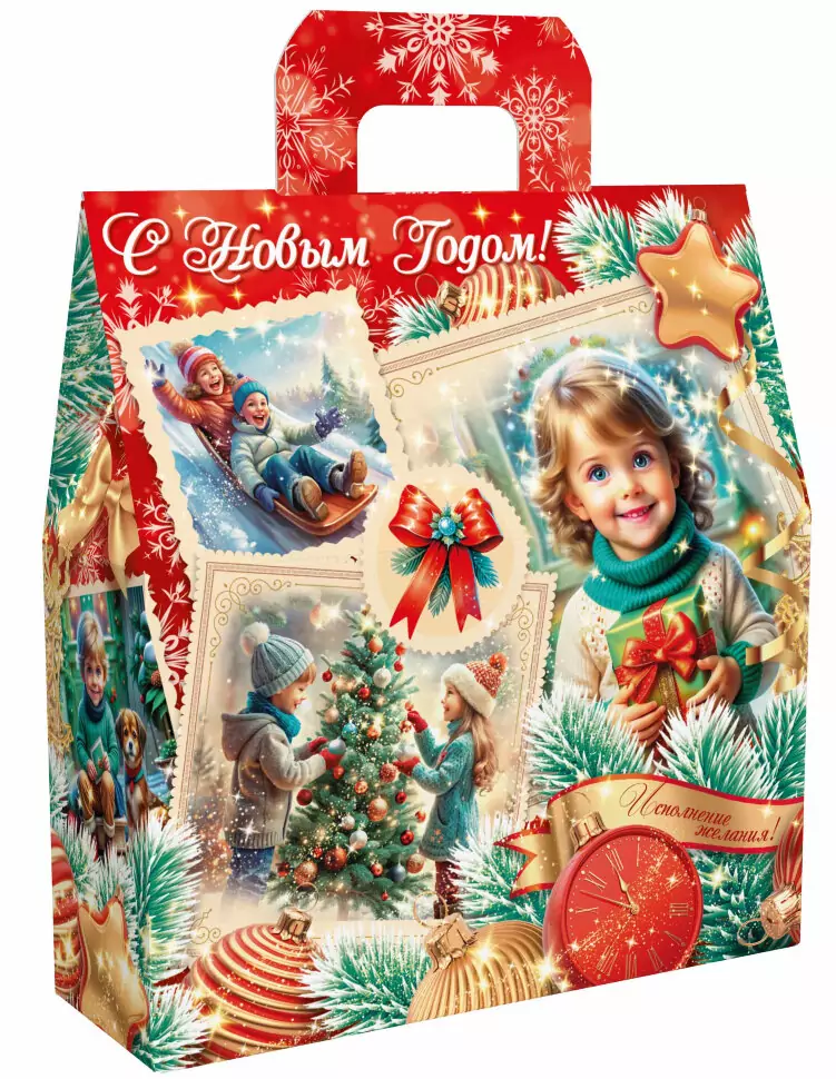Новогодний подарок Ретро - настоящее произведение искусства, созданное в стиле ретро-коллажа. На упаковке изображены радостные моменты зимних забав: дети, катающиеся с горки, украшенная ёлка, сверкающие гирлянды и милые детали, которые переносят нас в атмосферу детства. Надпись «С Новым Годом!» и «Исполнение желаний!» добавляют волшебства и тепла. Такой подарок подарит не только радость, но и ощущение счастья, напоминая о самых светлых моментах жизни. Отличный подарок как для детей, так и для взрослых! Наши подарки укомплектованы самыми вкусными конфетами и сладостями от лучших кондитерских производителей России: фабрики имени Крупской, Славянка, Акконд, КДВ, Вольский кондитер, Азовская, Сладуница, Нева, Дымка, Невский кондитер, Лотте, MARS и др.
