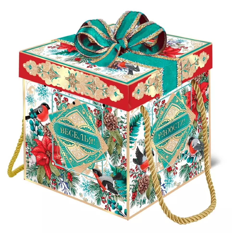 Сладкий новогодний подарок Сияние праздника - невероятно роскошный подарок! Дизайн данной упаковки выполнен в модных цветах Тиффани. Как известно, данный цвет пользуется неизменной популярностью в ювелирной отрасли с 19 века. В комплекте две золотые ручки из глянцевого шелка и атласная лента бирюзового цвета с золотым краем. Такой подарок подойдет как для детей разного возраста, детей коллег и сотрудников, так и для взрослых! Порадует маму, бабушку, друзей, коллег. Выразит любовь и признательность учителю, воспитателю. Наши подарки укомплектованы самыми вкусными конфетами и сладостями от лучших кондитерских производителей России: фабрики имени Крупской, Славянка, Акконд, КДВ, Вольский кондитер, Азовская, Сладуница, Нева, Дымка, Невский кондитер, Лотте, MARS и др.