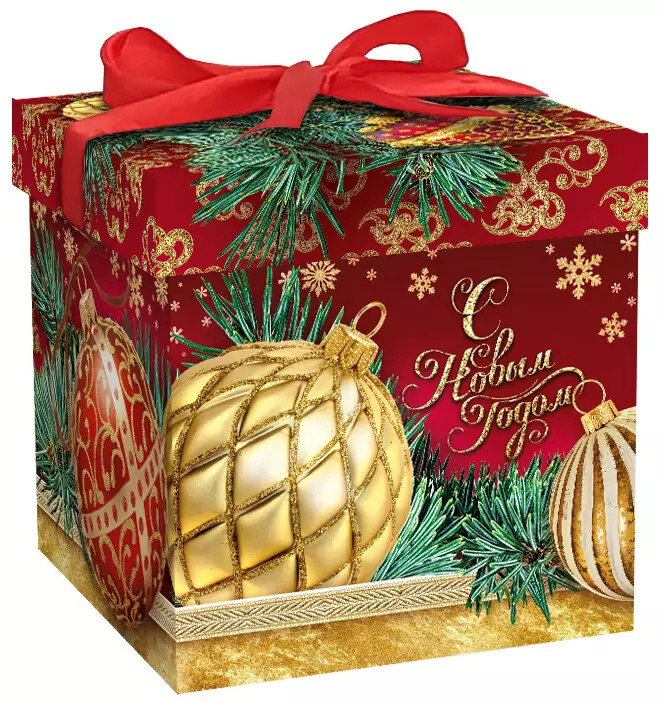 Погрузитесь в атмосферу настоящего торжества с нашим сладким новогодним подарком, упакованным в изысканную коробку украшенную роскошными золотыми ёлочными шарами и элегантным атласным бантом. Такой подарок непременно оценят как взрослые, так и дети! Порадубт маму, бабушку, коллегу, друзей, учителя. Каждая деталь этого подарка говорит о внимании к деталям и истинном праздничном шике - роскошная упаковка с тиснением из золотой фольги, нанесение блесток, атласный красный бант.