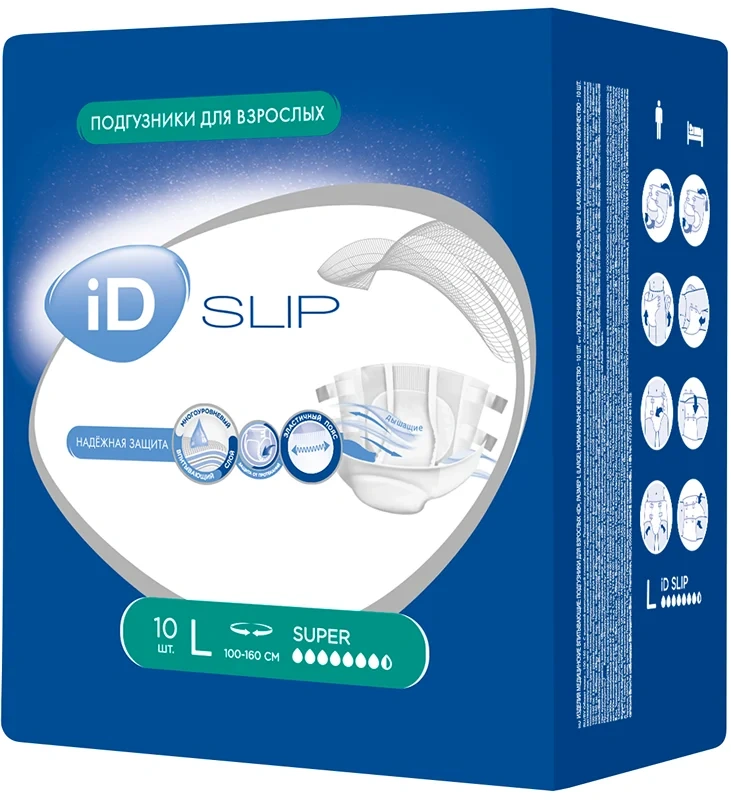 Предназначены для использования при тяжелой степени недержания. Они особенно рекомендованы для людей с ограниченной подвижностью или для лежачих больных. Многоуровневый впитывающий слой позволяет подгузникам iD Slip впитывать и надежно удерживать внутри большое количество жидкости и блокировать неприятные запахи. Благодаря анатомической форме подгузника, манжетам в области ног, эластичному на спине поясу и многоразовым застежкам-липучкам, которые надежно фиксируют подгузник, памперсы для взрослых отлично прилегают к телу и гарантируют надежную защиту от протеканий и максимальный комфорт. Индикатор влагонасыщения показывает степень наполнения.