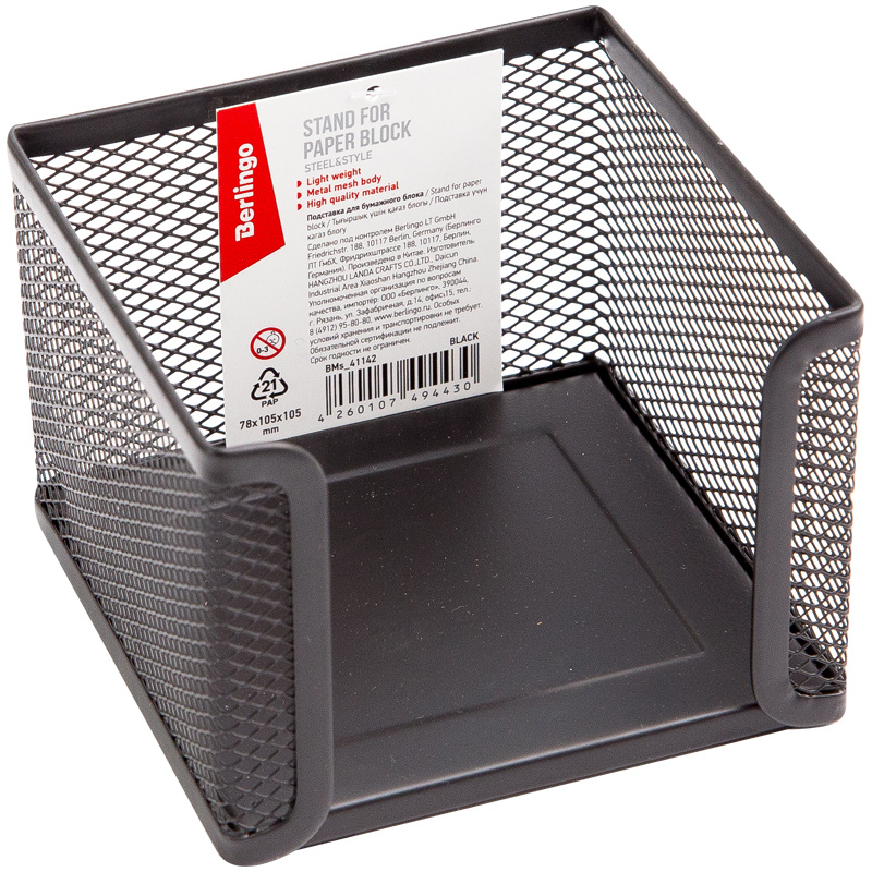 Подставка для бумажного блока Berlingo Steel&Style – стильный и практичный атрибут рабочего стола. Прочный чёрный корпус выполнен из высококачественного металла, а сетчатое исполнение предотвращает образование пыли внутри. Подходит для хранения бумажных блоков размерами до 100*100мм, идеально сочетается с другими товарами серии Steel&Style. Имеются мягкие подушечки на дне, предотвращающие скольжение и повреждения поверхности. • Материал: металл;• Цвет: чёрный;• Количество секций: 1.• Размер: 10,5*10,5*7,5 см.