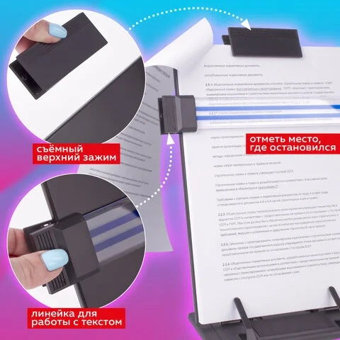 Регулируемый наклон позволяет максимально удобно располагать книгу или журнал на рабочем месте индивидуально для каждого читателя. Материал корпуса выполнен из металла, а основания и держатели страниц - из прочного пластика. Антискользящие вставки обеспечивают устойчивое расположение на любой поверхности. Подставка оснащена съёмным верхним зажимом и линейкой для работы с текстом - вы быстро сможете вернуться к нужному фрагменту.