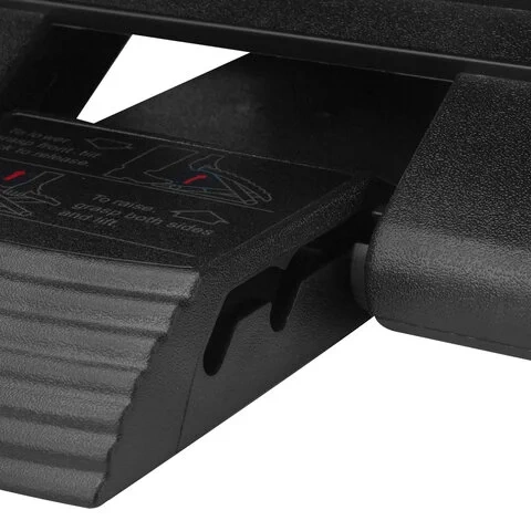 Представляет собой устойчивую и прочную пластиковую конструкцию с размером платформы 46х34 см. Имеет регулируемый угол наклона от 0 до 30°. Основание подставки снабжено покрытием, препятствующим скольжению.