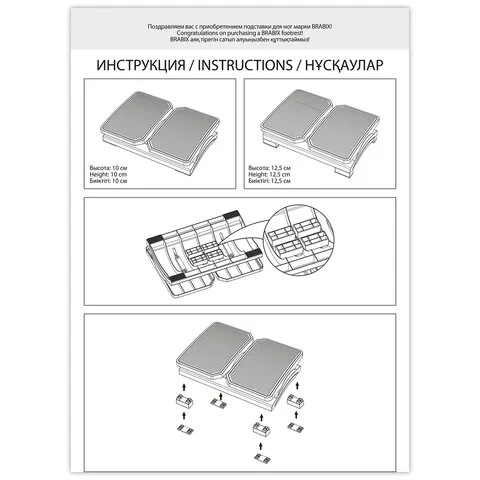 Представляет собой устойчивую и прочную пластиковую конструкцию с двумя платформами общим размером 43х32 см. Возможна установка угла наклона от 0 до 25°. Платформы регулируется независимо друг от друга. В комплекте есть дополнительные ножки, увеличивающие высоту подставки на 2,5 см.