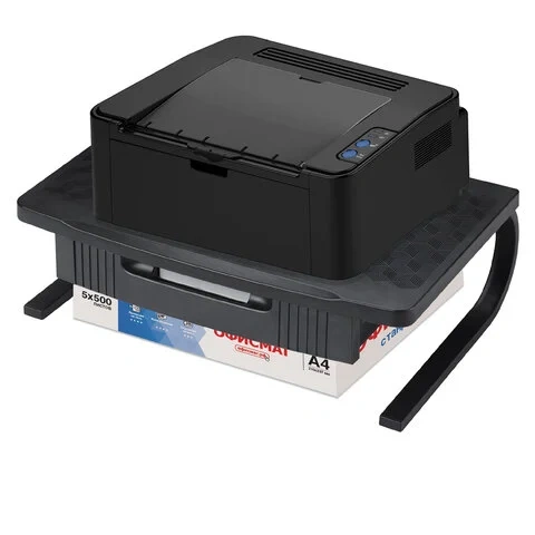 Размер подставки: 46х30х14,5 см. По центру расположен выдвижной ящик для канцелярских принадлежностей. Основание выполнено из металла.