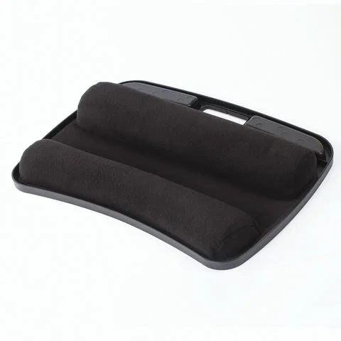Изготовлена из прочного ABS-пластика. Снабжена 2-мя подушками из мягкого флиса для комфортного расположения на коленях. Для удобной транспортировки предусмотрена ручка. В подставке имеются 2 отделения для мелочей. Размер - 48х33,5 см.