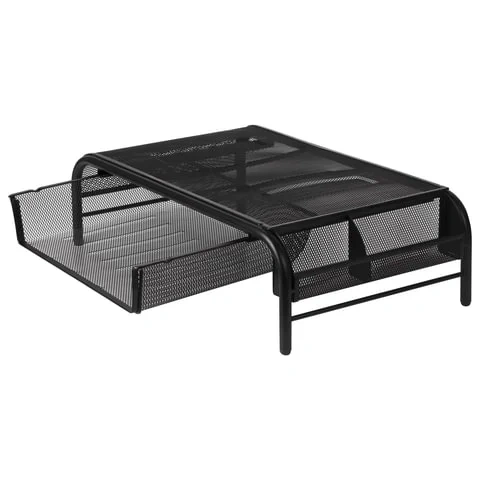 Подставка снабжена лотком для бумаг и документов, а также двумя отделениями для канцелярских мелочей. Жесткая конструкция из металлической сетки выдерживает нагрузку до 5 кг. Сетчатое строение не препятствует притоку воздуха, благодаря чему снижается риск перегрева дорогостоящей техники.