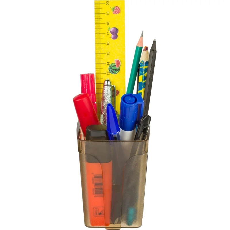 Подставка для канцелярских мелочей Attache хорошо подойдет для рабочего стола и не займет много места. Все необходимые канцелярские принадлежности всегда будут под рукой. Подставка для канцелярских мелочей Attache City изготовлена из прозрачного пластика коричневого цвета. Имеет одно отделение для различных пишущих принадлежностей. Сочетается с другими канцелярскими принадлежностями из коллекции City. Размеры: 100×70×70 мм.