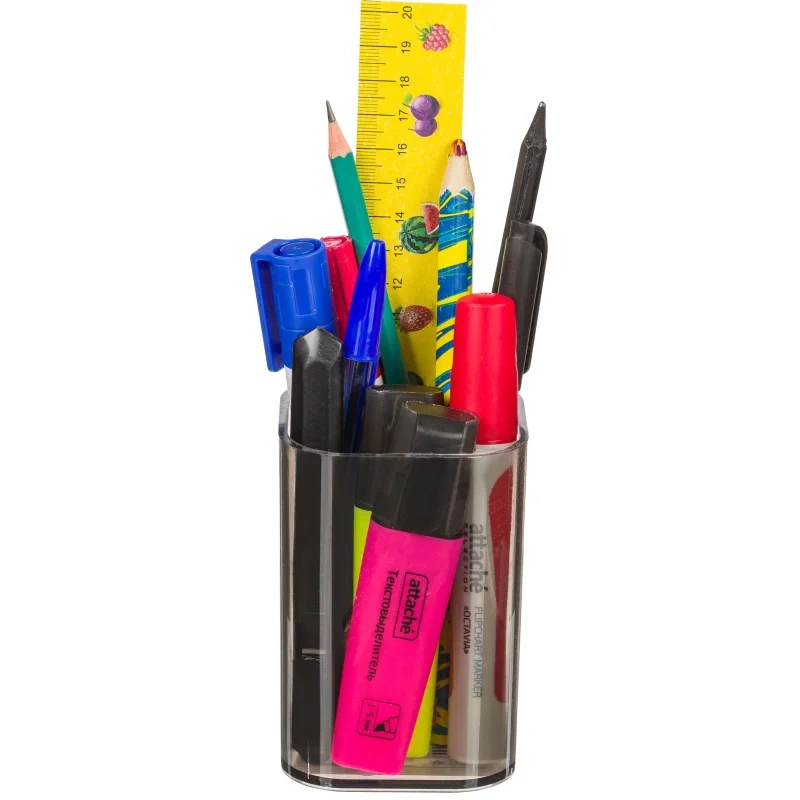 Подставка для канцелярских мелочей Attache Office подойдет для рабочего стола и не займет много места. Все необходимые канцелярские принадлежности всегда будут под рукой. Размер подставки 100×70×70 мм. Подставка изготовлена из прозрачного тонированного черным пластика. Не является вращающейся.