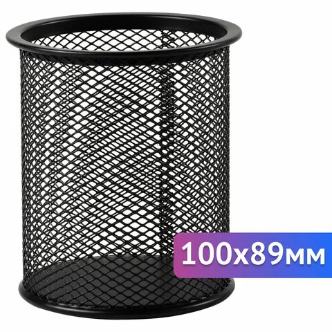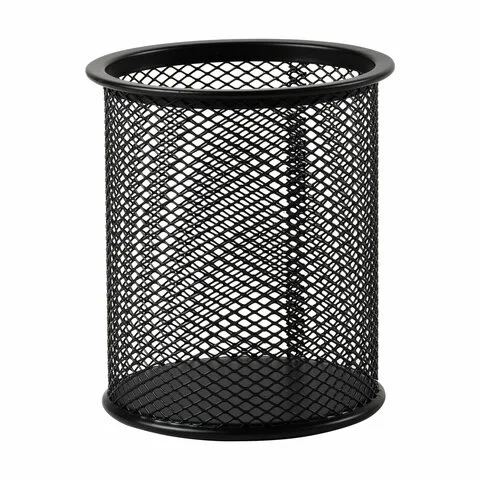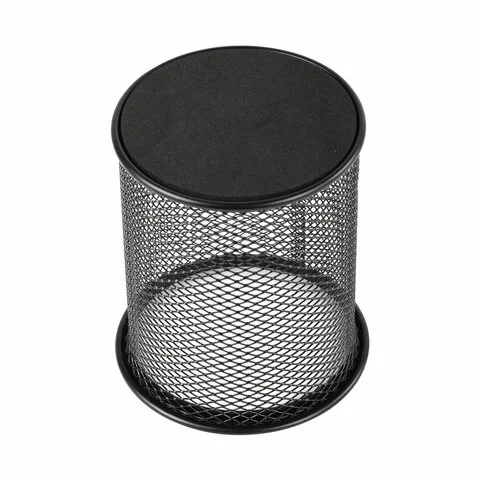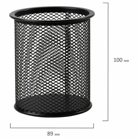 Изготовлена из металлической сетки. Имеет размеры 100х89х89 мм. Состоит из одного отделения. Мягкие подушечки на дне предотвращают скольжение и порчу мебели. Поставляется без канцелярского наполнения.
