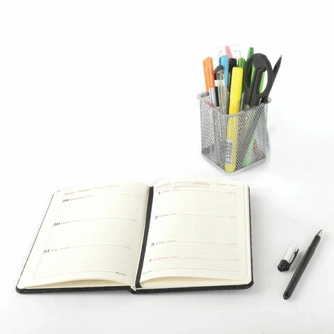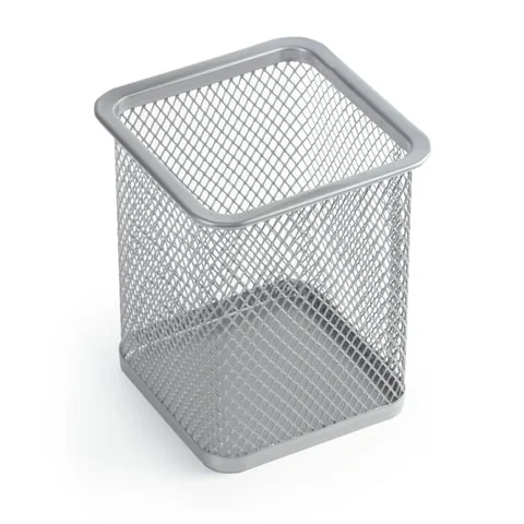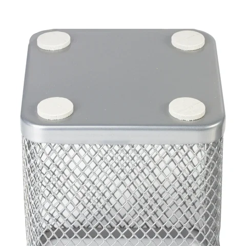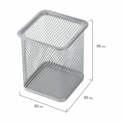 Изготовлена из металлической сетки. Имеет размеры 98х80х80 мм. Состоит из одного отделения. Мягкие подушечки на дне предотвращают скольжение и порчу мебели. Поставляется без канцелярского наполнения.