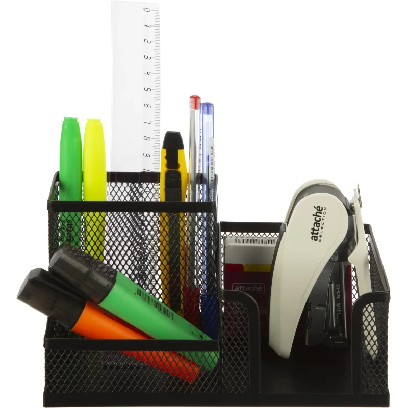 Вместительный стакан для канцелярских принадлежностей классического дизайна. Изготовлен из тонированного пластика сочных оттенков.
