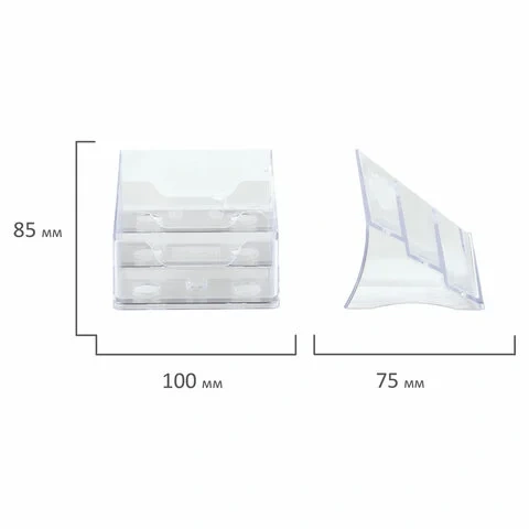 Изготовлена из прозрачного оргстекла. Имеет три отделения, способных вместить 150 визиток шириной 90 мм. Размер - 85х100х75 мм. Поставляется в защитной пленке.