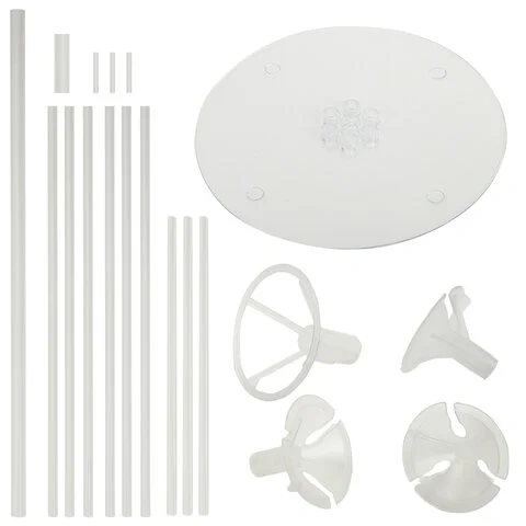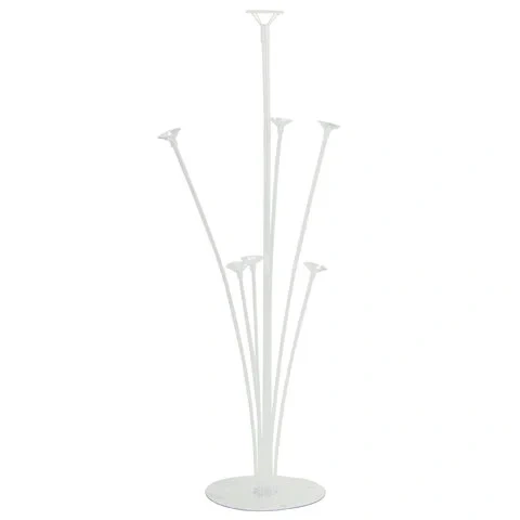 Подставка для воздушных шаров представляют собой полипропиленовую вертикальную конструкцию с круглым плоским основанием из полистирола. В основание вставляются полипропиленовые палочки разной длины, на которых можно закрепить 7 воздушных шаров. Чтобы шарик оставался на месте, на конце палочки крепятся насадки из полипропилена, на которые привязывают «хвостик» надувного шарика.