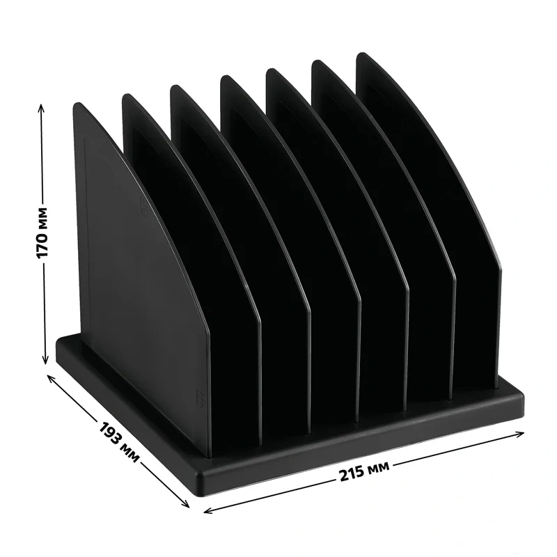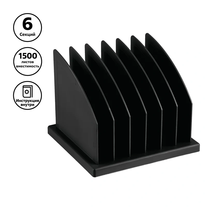 Лоток-сортер 6 отделений для бумаг форматов А4, А5. Современный дизайн, быстрая и легкая сборка. Возможна установка перегородок в вертикальном и горизонтальном положениях. Удобная конструкция предусматривает регулировку ширины отделений. Изготовлен из качественного пластика. Упакован в термоусадочную пленку, поставляется в разобранном виде. Инструкция по сборке в комплекте. Цвет лотка - черный. Изделие высотой 170мм, глубиной 193мм, шириной 215мм вмещает 1500 листов.