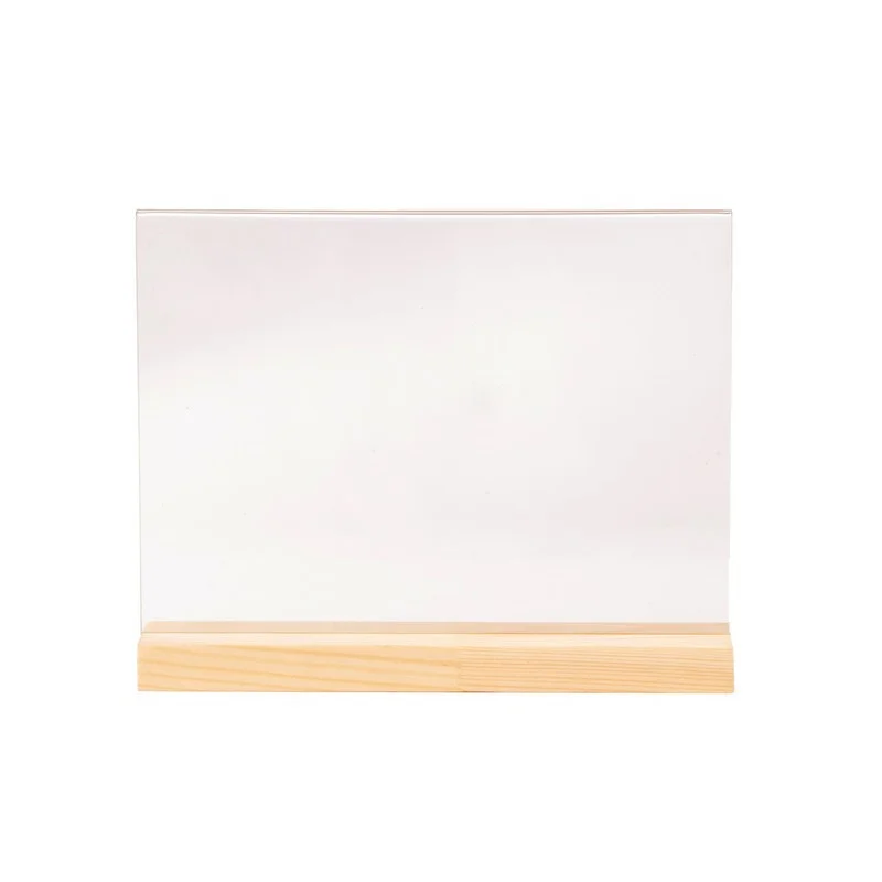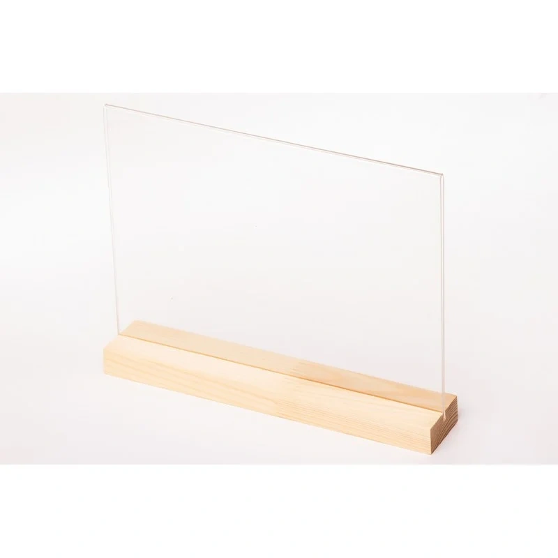 Подставка двусторонняя настольная А5, горизонтальная, деревянное основание. Размер: 210?40?170 мм. На деревянном основании, выполненном из древесины хвойных пород дерева, располагается акриловый держатель (акрил 1,5 мм), предназначенный для размещения постеров формата А5 в горизонтальном положении. Деревянное основание покрыто лаком для защиты от загрязнений.