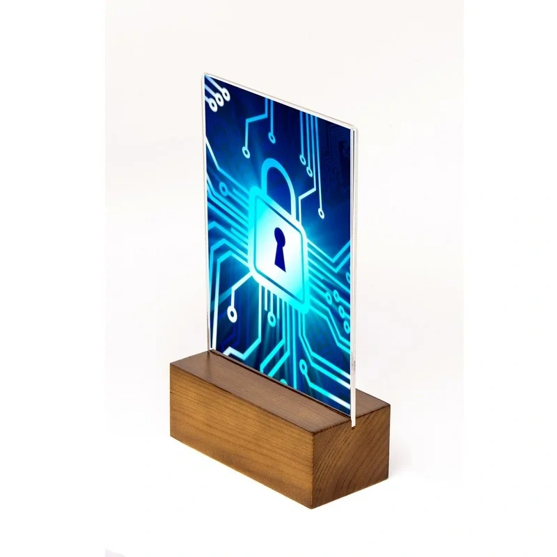 Подставка двусторонняя настольная А6, вертикальная, деревянное основание. Размер: 105?50?185 мм. На деревянном основании, выполненном из древесины хвойных пород дерева, располагается акриловый держатель (акрил 1,5 мм), предназначенный для размещения постеров формата А6 в вертикальном положении. Деревянное основание обработано лакокрасочным покрытием цвета «Орех».