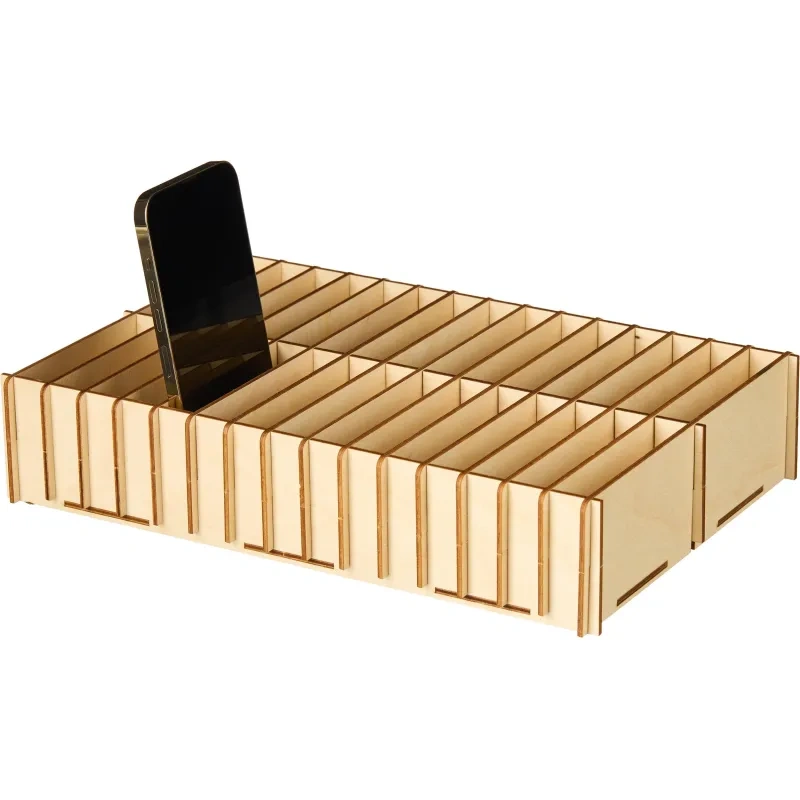 Подставка для телефонов в школу, выполненная из дерева - это органайзер, который поможет организовать рабочее пространство и обеспечить удобный доступ к гаджетам, визиткам, аксессуарам и другим необходимым вещам. Этот настольный держатель хранит мобильные телефоны в удобных ячейках, что делает его незаменимым предметом в школе. С его помощью можно сохранить порядок на столе и убрать ненужные предметы в ячейки. Деревянный ящик - это качество и долговечность. Это экономия времени на поиск телефона по всему классу или кабинету, возможность всегда знать, где находится ваш смартфон.