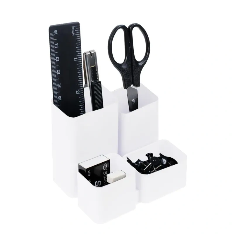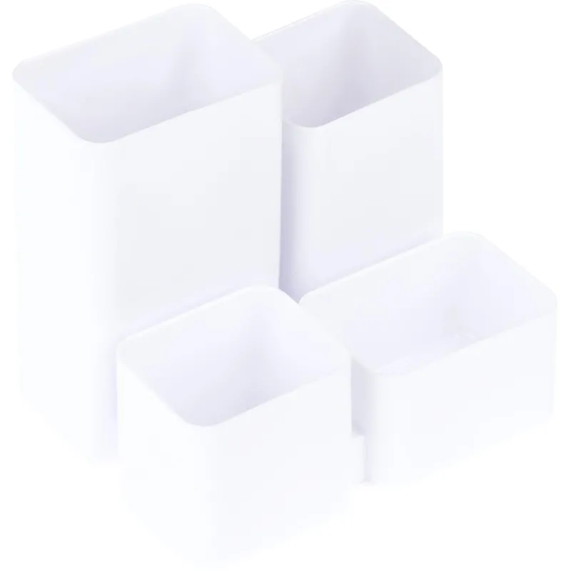 Настольная подставка Стамм предназначена для хранения канцелярских принадлежностей. Прочный корпус, оригинальный дизайн. Размер изделия — 102×108×80 мм. Подставка имеет 4 отделения разных размеров. Изготовлена из качественного полистирола. Цвет изделия — белый.