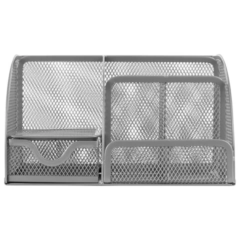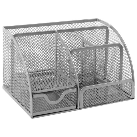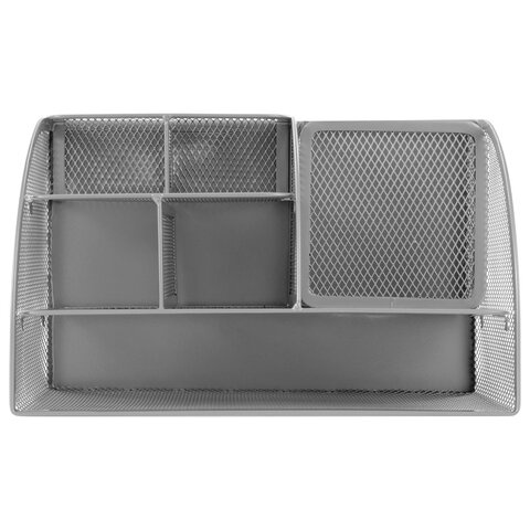 Изготовлена из металлической сетки. Имеет размеры 125х220х140 мм. Выполнена в серебристом цвете. Состоит из 7-ми секций, которые позволяют хранить и сортировать самые разные канцелярские принадлежности: от блоков для записей и кнопок - до ручек и текстовыделителей. Мягкие подушечки на дне предотвращают скольжение и порчу мебели. Поставляется без канцелярского наполнения.