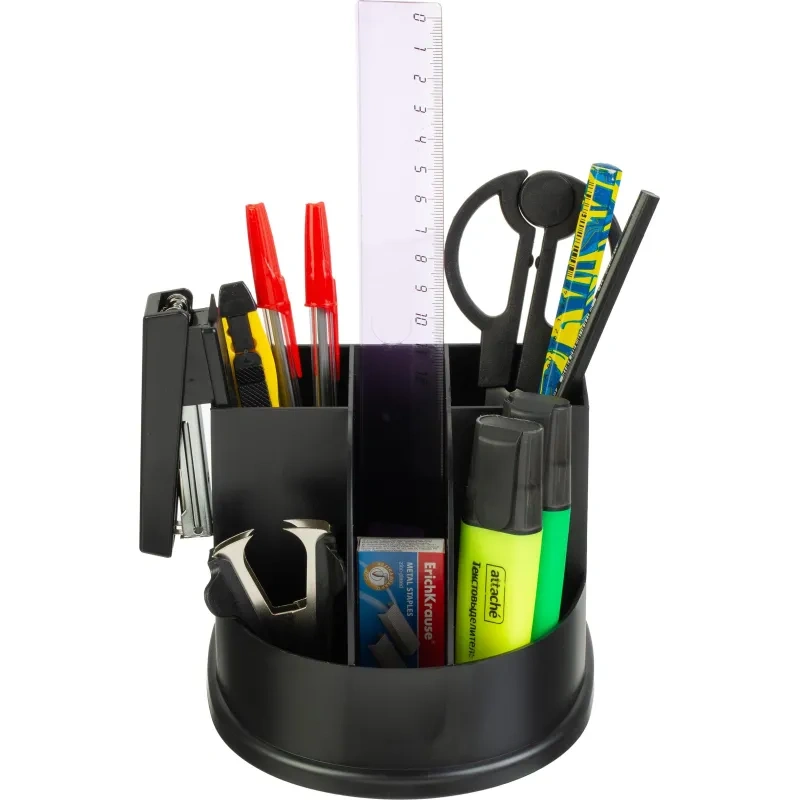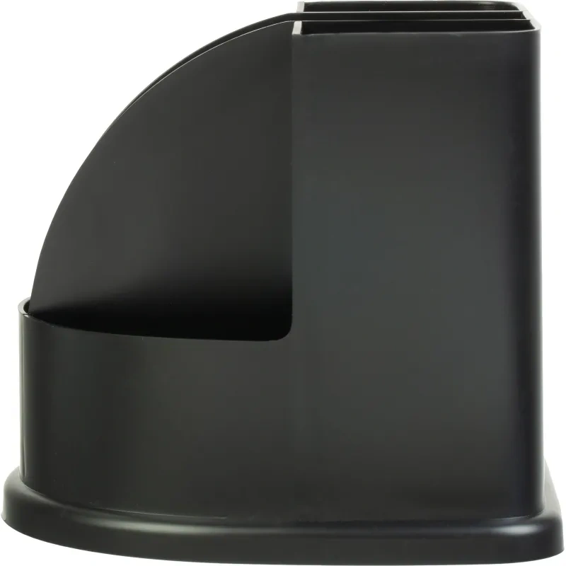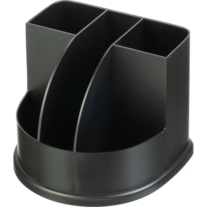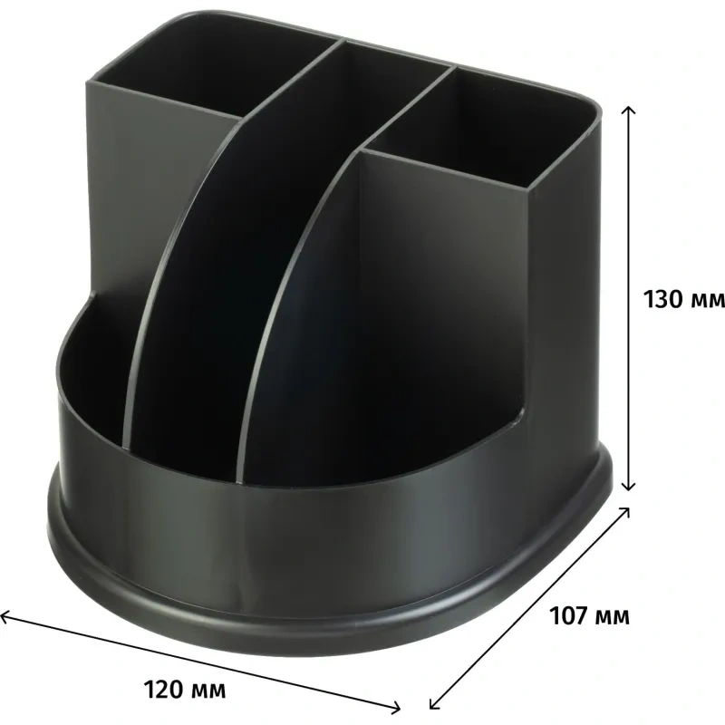 Подставка для канцелярских мелочей Выбор есть хорошо подойдёт для рабочего стола и не займёт много места. Все необходимые канцелярские принадлежности всегда будут под рукой. Подставка для канцелярских мелочей Выбор есть с гладкой полированной поверхностью выполнена из пластика чёрного цвета. Состоит из пяти секций разного размера для визиток, канцелярских принадлежностей, листов для записей. Размеры: 13×12×10.7 см.